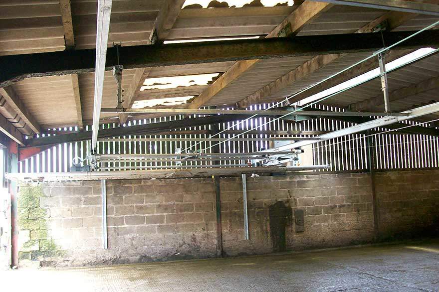 The Warrior “up and over” backing gate is suitable for use in rectangular collecting yards. The backing gate is fixed to a rigid gantry, traveling on two tracks suspended from the roof trusses. Both drive and lift motors are fixed at one end of the track.